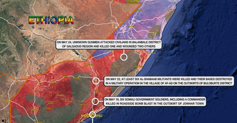 On May 19, six Somali government soldiers, including a commander killed in roadside bomb blast in the outskirt of Jowhar…