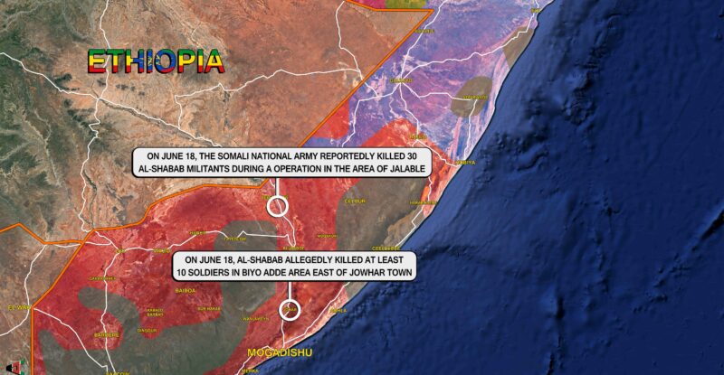 On June 18, al-Shabab allegedly killed at least 10 soldiers in Biyo Adde area east of Jowhar town On June…