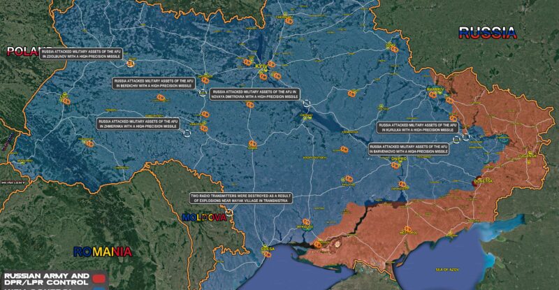 Two radio transmitters were destroyed as a result of explosions near Mayak village in Transnistria; Russia attacked military assets of…