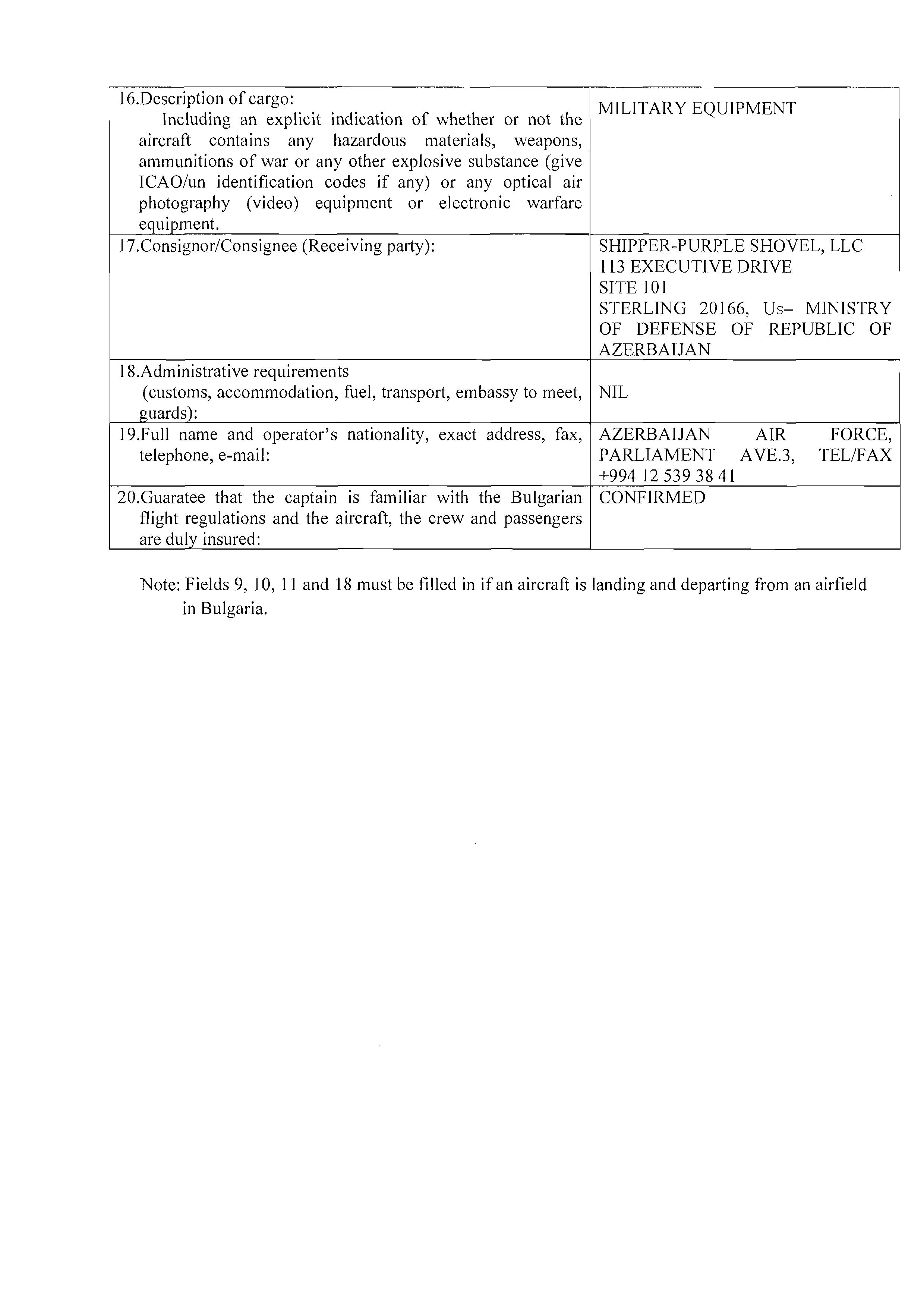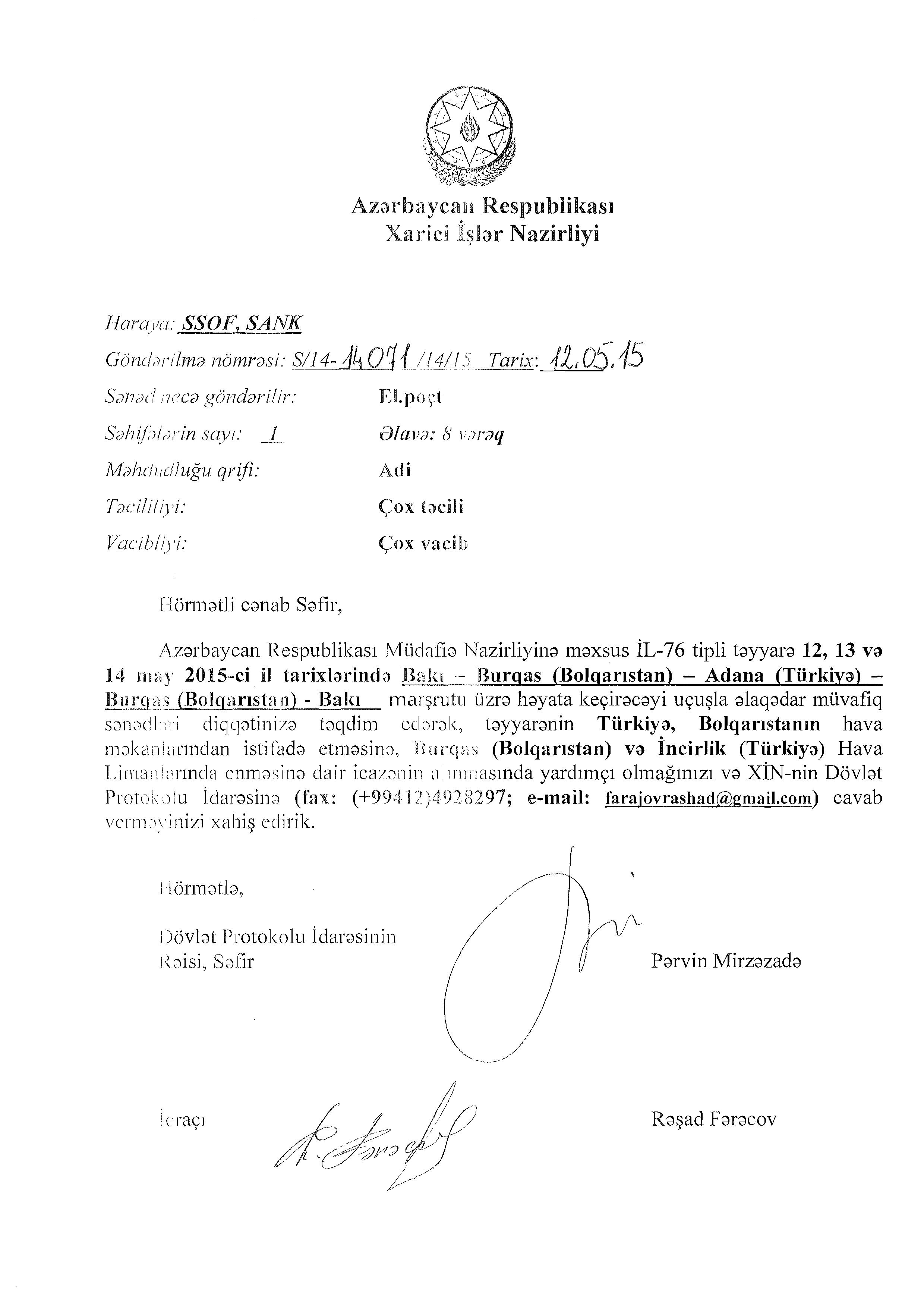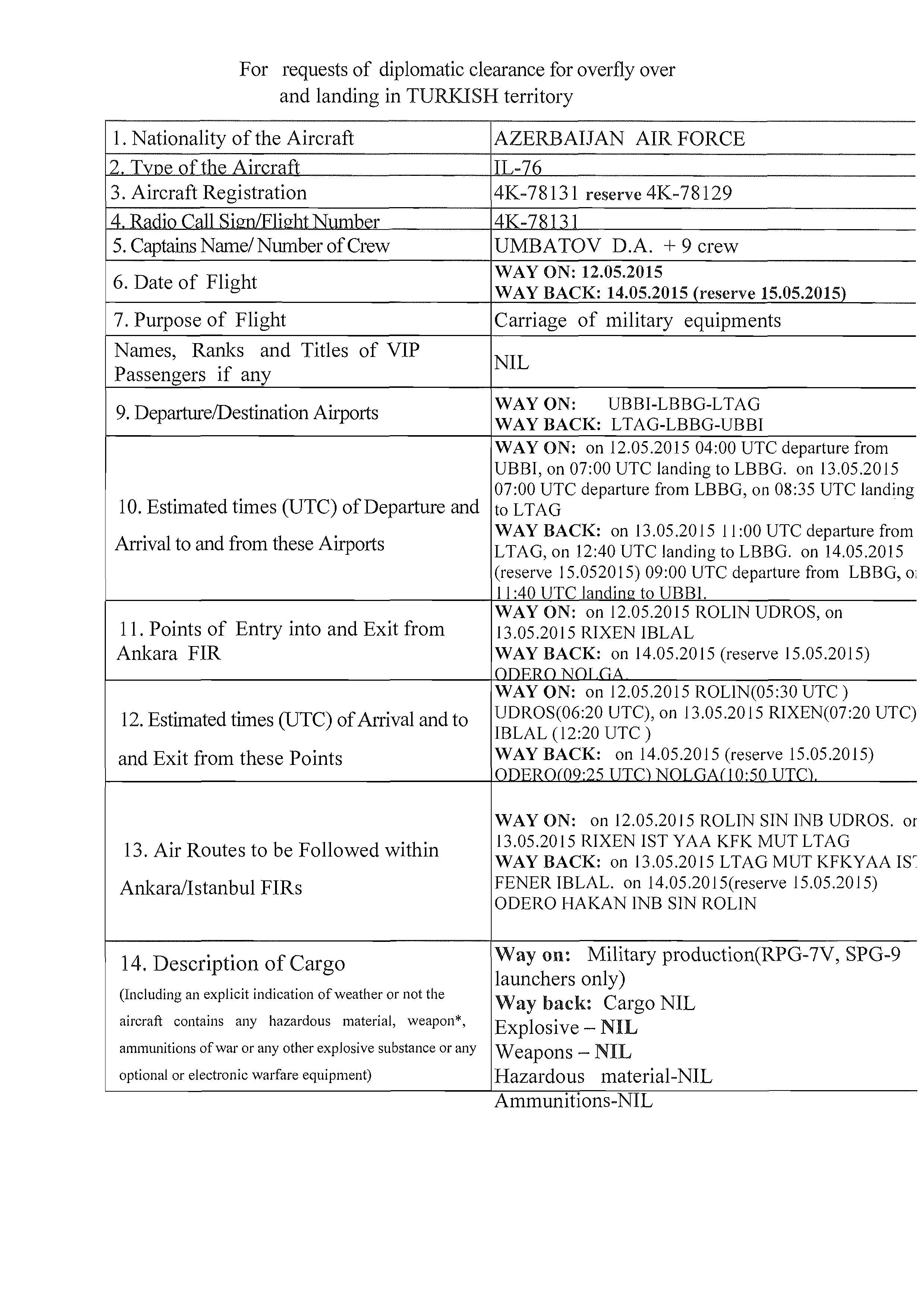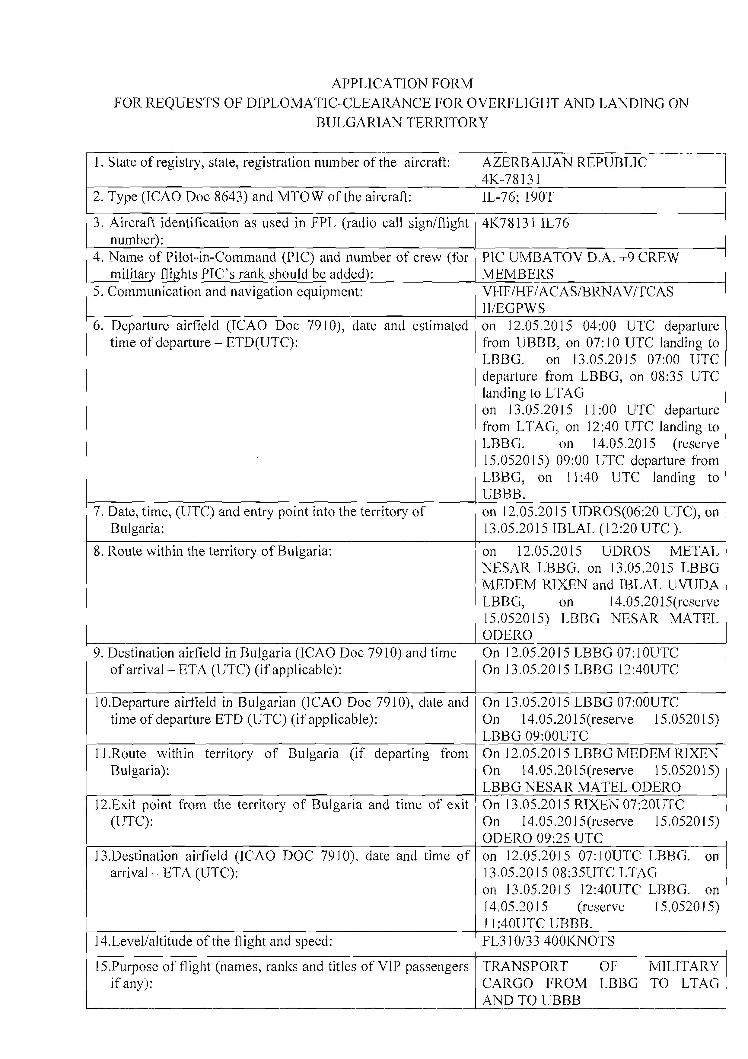 The Azeri Embassy in Sofia sent a diplomatic note AZN 114/15 dated 4 May 2015 to the Bulgarian Foreign Ministry and received a diplomatic note from the ministry the next day that the diplomatic flight was approved. However, Bellingcat did not show this document because it proves that there was no mistake with Emco and no false application and that this flight did take place with a diplomatic permit 194-45 dated 4 May 2015.