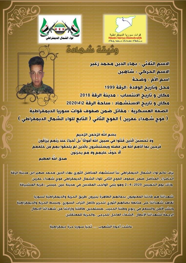 The Northern Democratic Brigade (NDB) acknowledged on April 3 that two of its fighters were killed in the town of Ain Issa in northern Raqqa.
