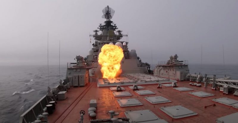 The Russian Northern Fleet’s nuclear-powered Kirov-class battlecruiser Pyotr Veliky and Slava-class cruiser Marshal Ustinov supported by Tu-22M3 strategic bombers of…