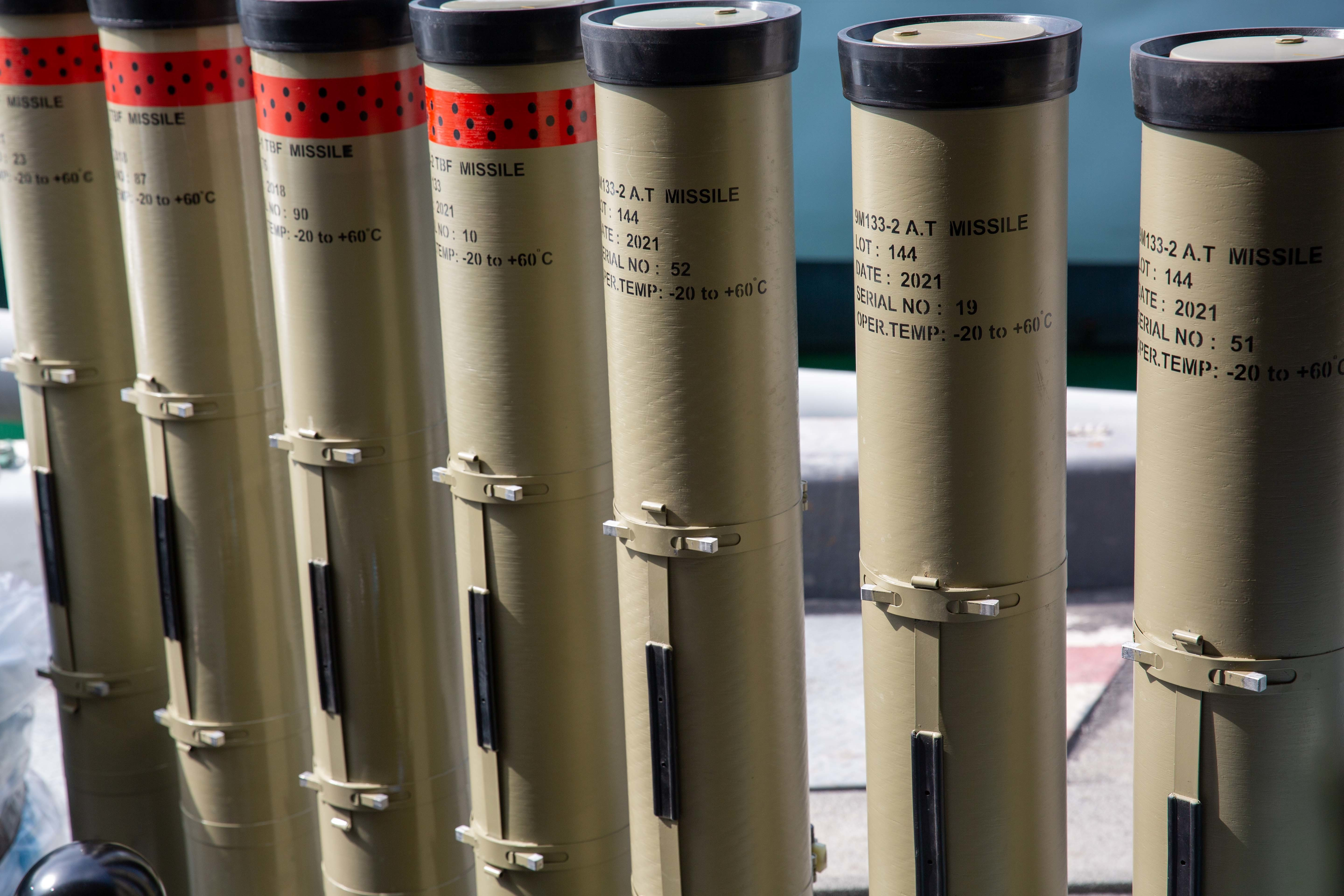 - Anti-tank guided missile tubes seized by the United Kingdom Royal Navy sit pierside during inventory at a military facility in the U.S. 5th Fleet area of operations, Feb. 26, 2023. (Photo by Sgt. Brandon Murphy)