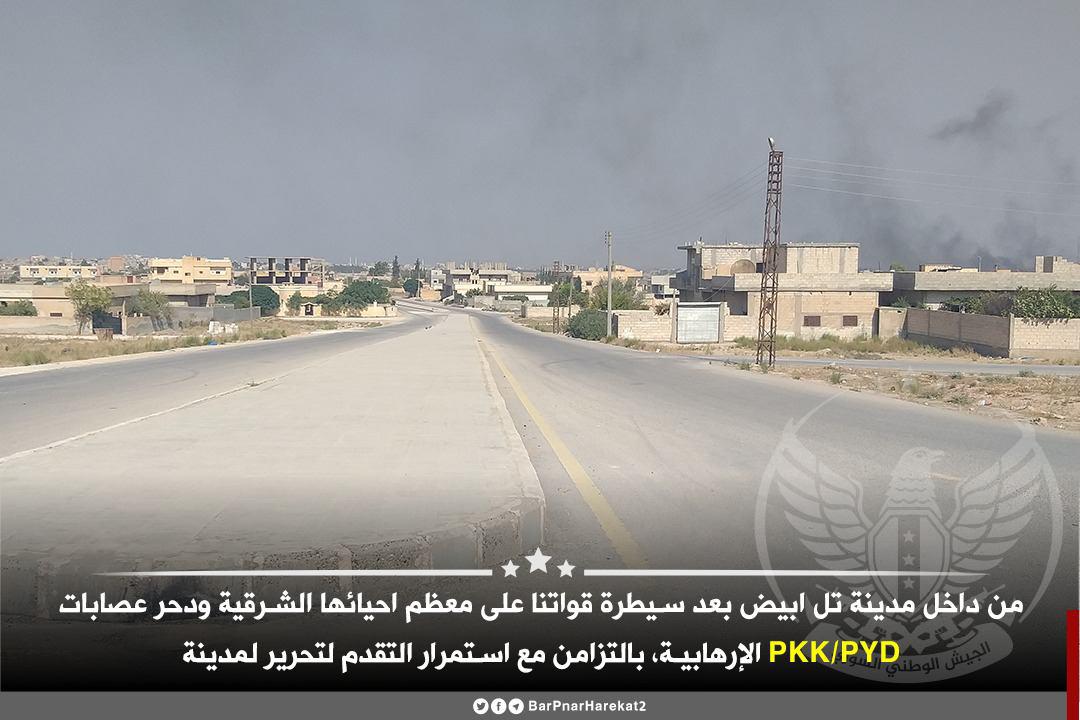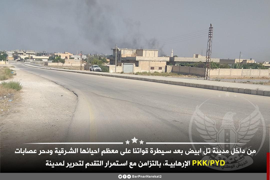 A few hours after storming Tell Abyad from the eastern and western directions, the NSA announced that its militants imposed full control of the town. Several photos and a video showing NSA militants inside the town were released.